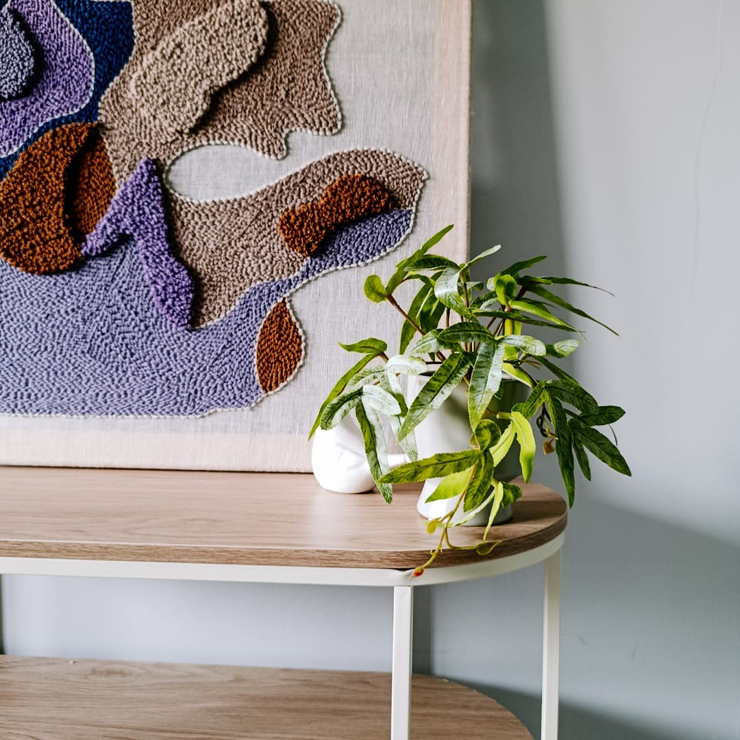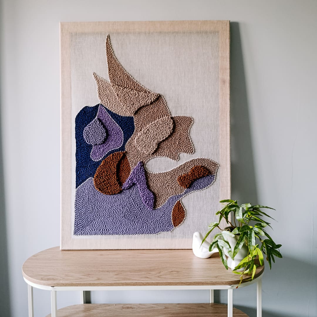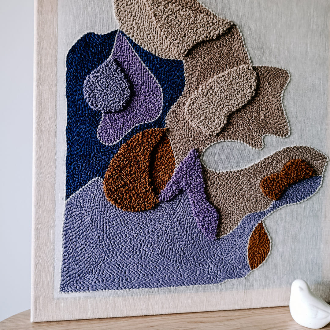 Abstrakcyjny obraz punch needle wykonany z wełnianej włóczki o świetnym składzie: 65% wełna, 35% alpaka. Wełna pochodzi z Ameryki Południowej. Włóczka posiada certyfikat Oeko-Tex® wydany przez Hohenstein Institute. Oznacza to, że została zbadana na obecność substancji szkodliwych i została uznana za bezpieczną pod względem ekologicznym.