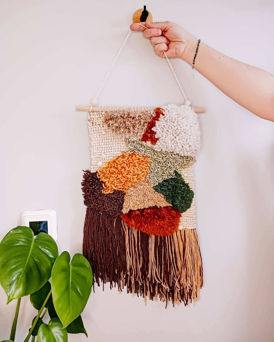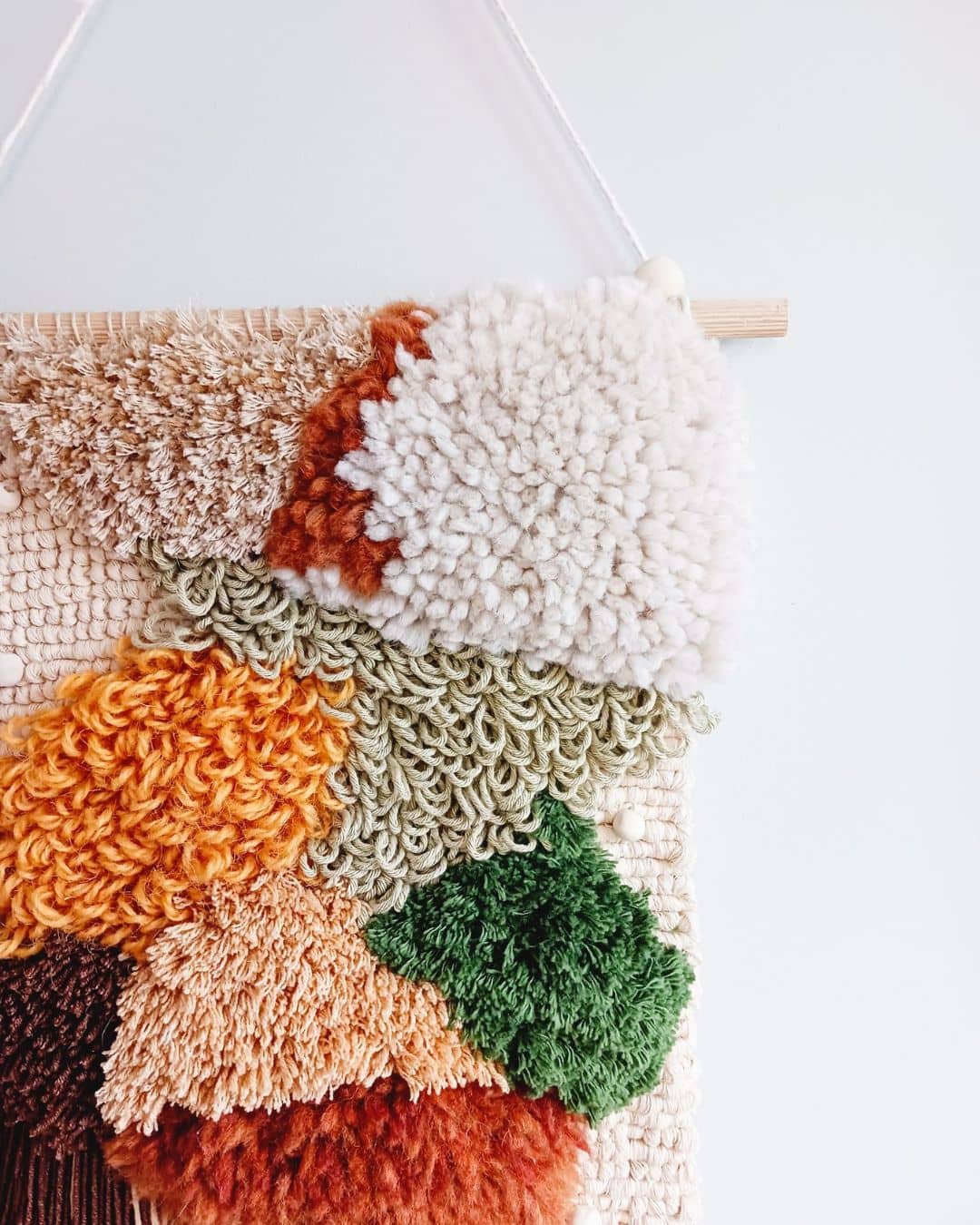 Makatka została wykonana ręcznie w technice latch hook z wysokiej jakości włóczek: wełnianej, bawełniano-akrylowej i bawełnianej oraz bawełnianego sznurka, co zapewnia różnorodność faktur i wrażeń dotykowych. Dzięki nieregularnym frędzlom, które nadają jej artystycznego i nieco dzikiego charakteru jest absolutnie unikatowa.