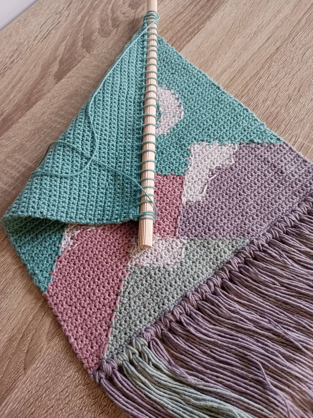 Makatka została wydziergana ręcznie na szydełku z miękkiej bawełnianej włóczki najlepszej jakości o pięknych kolorach. Umieszczona na toczonym drewnianym wałku i wykończona frędzlami. Jej wymiary to ok. 27 x 46 cm z frędzlami.