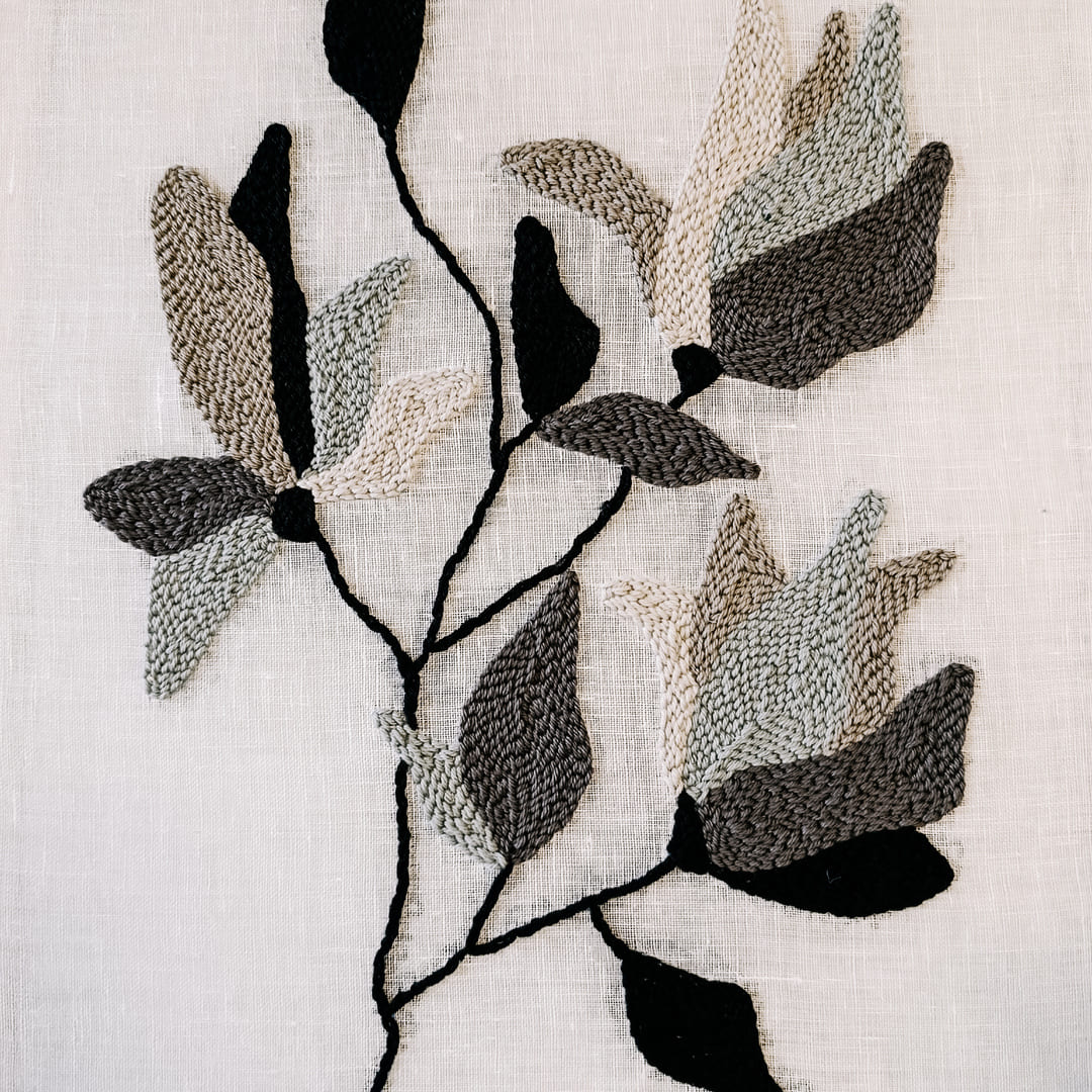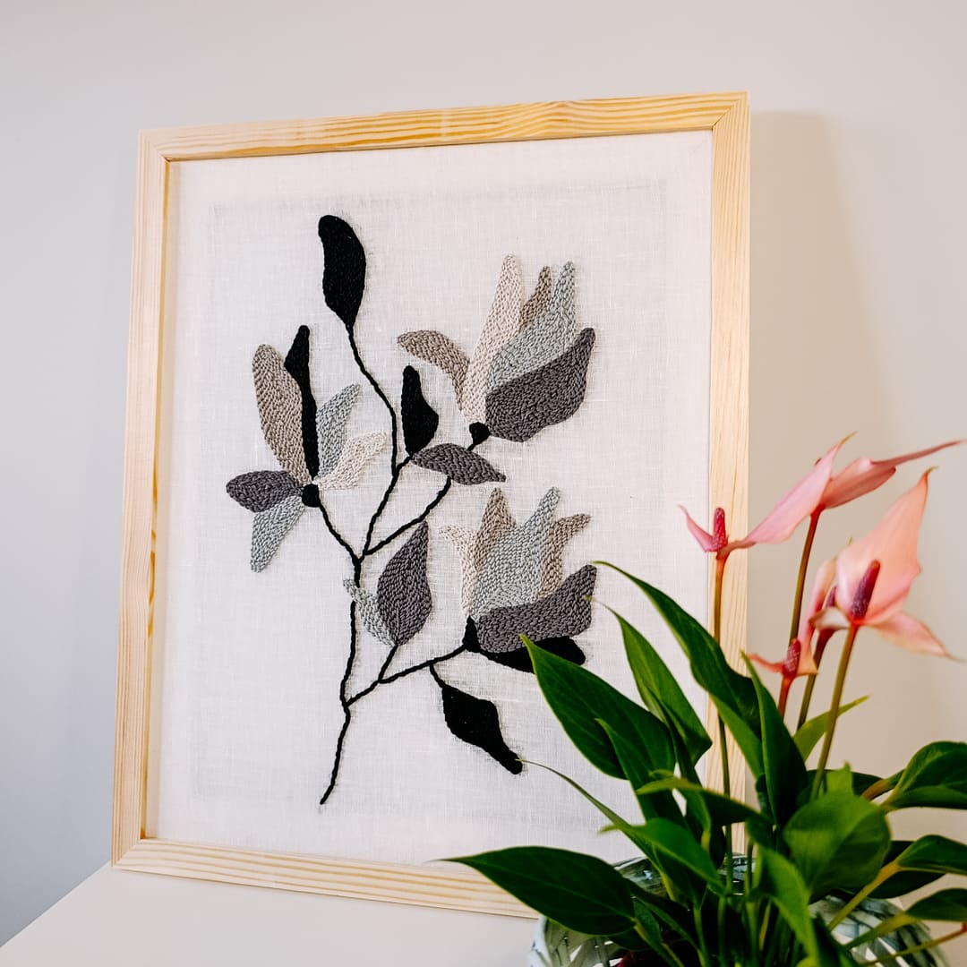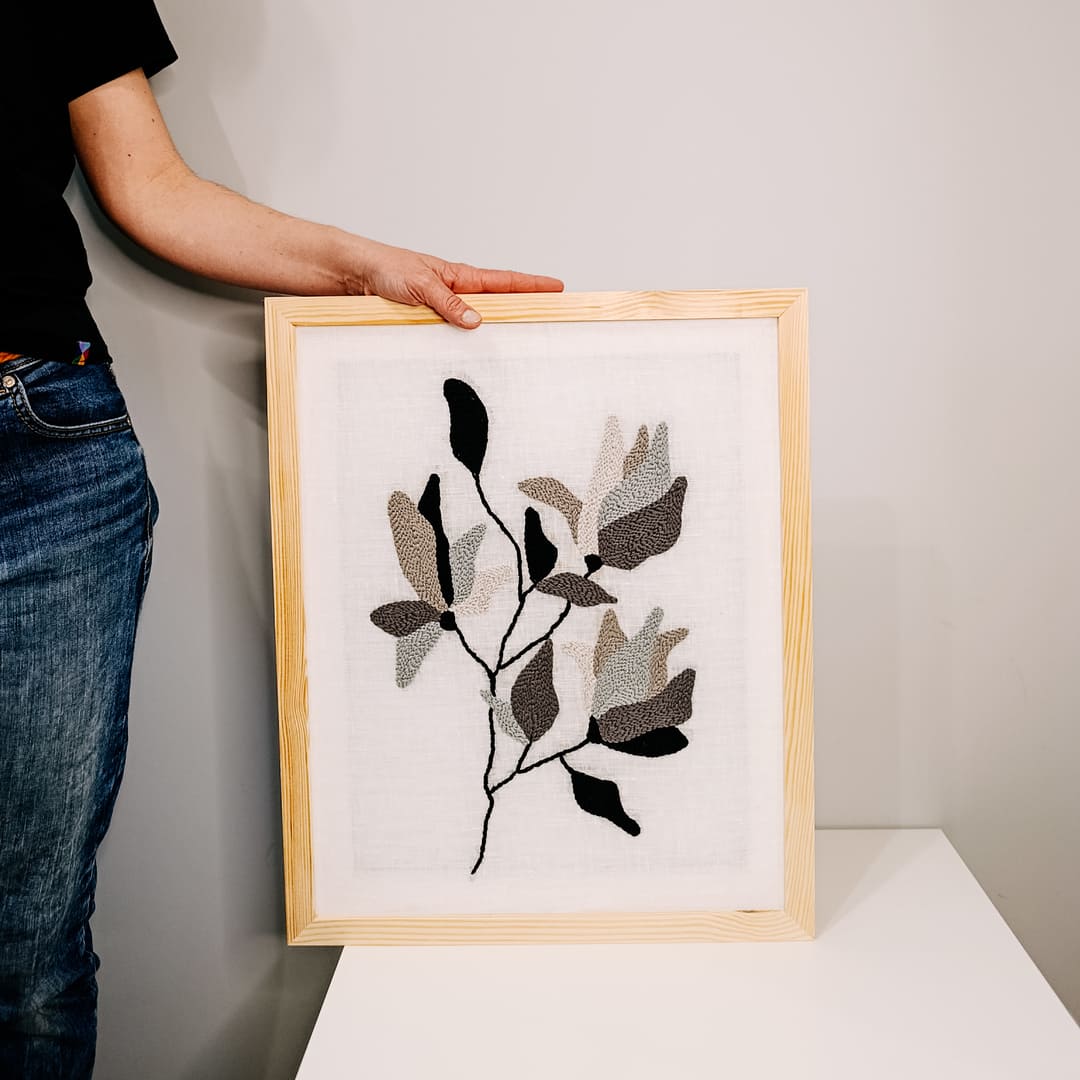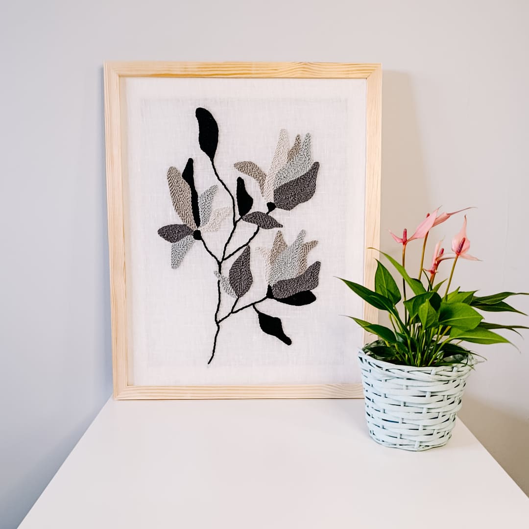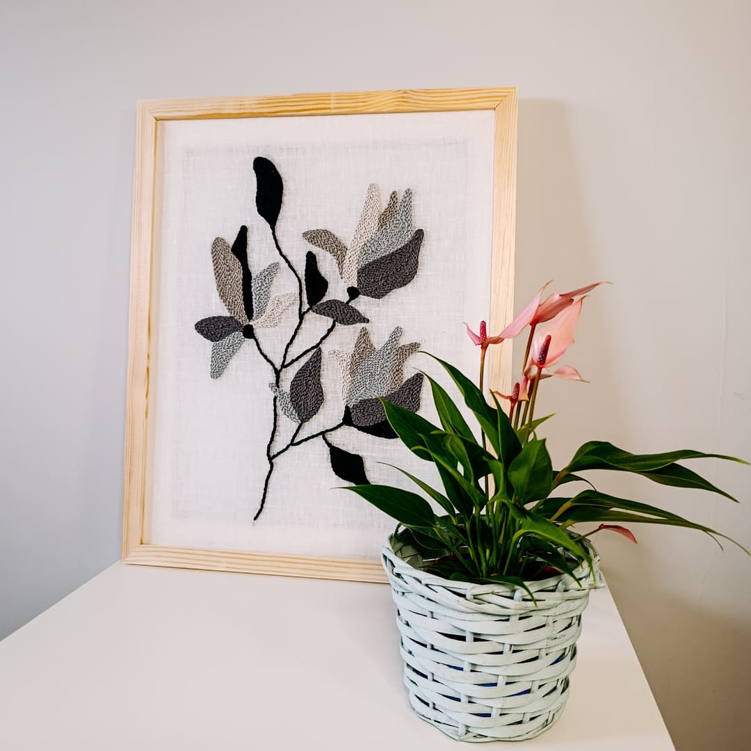 Obraz powstał z naturalnych materiałów: delikatnego bielonego lnu stanowiącego tło dla haftu, miękkiej bawełnianej włóczki oraz drewnianej ramy o surowym wykończeniu. Każdy detal został starannie wykonany ręcznie, dzięki czemu praca jest niepowtarzalna i pełna osobistegocharakteru.