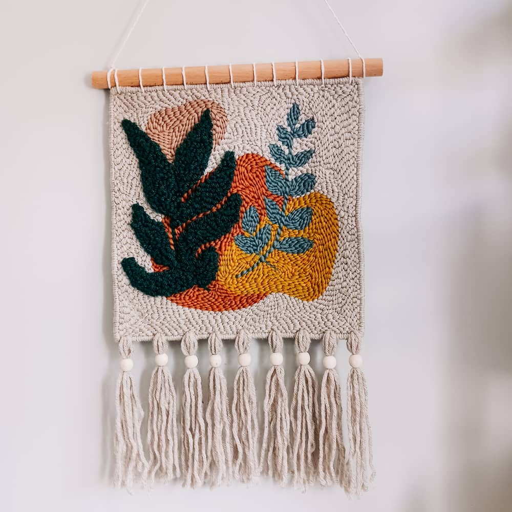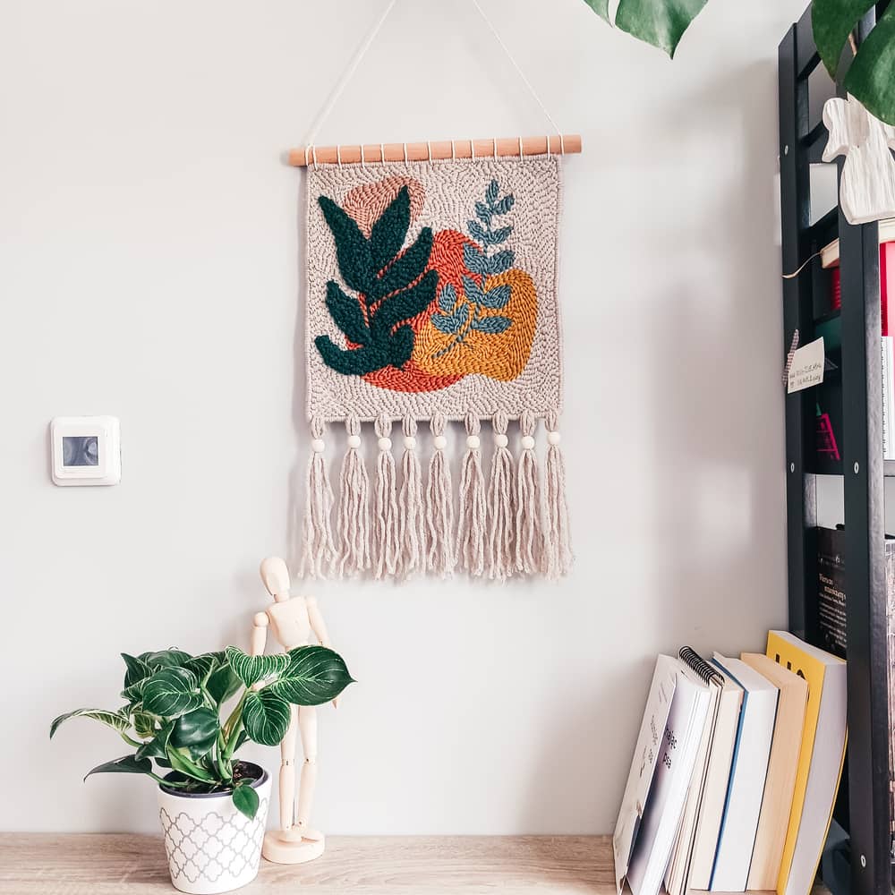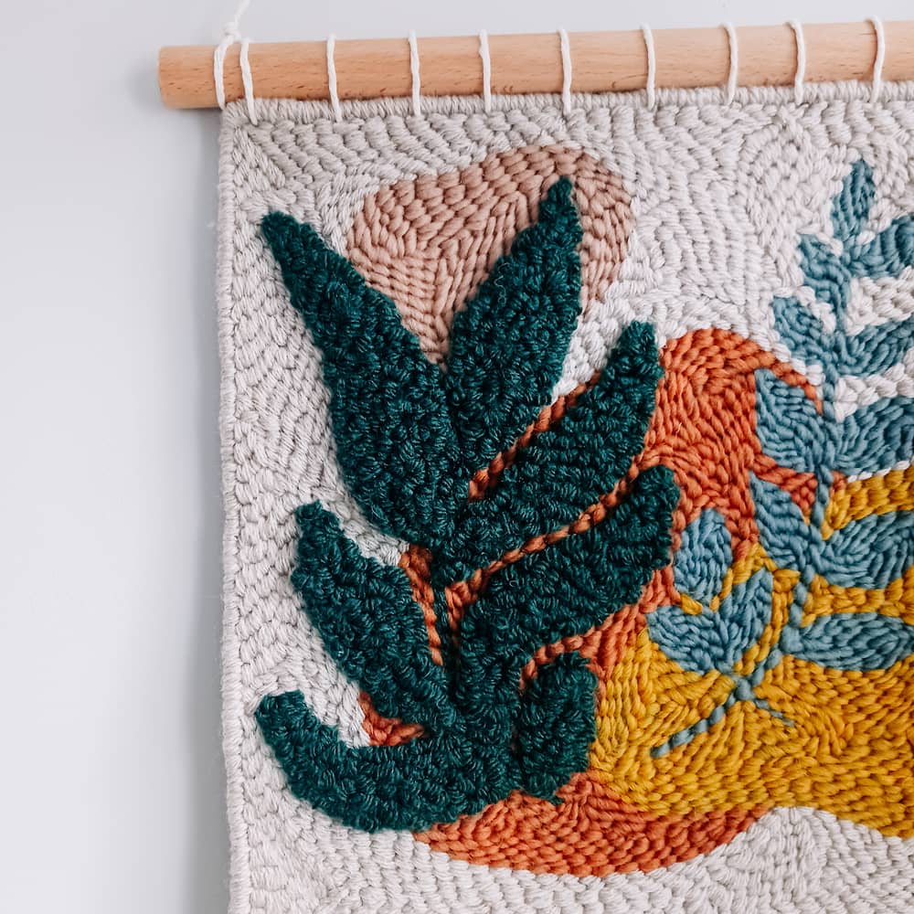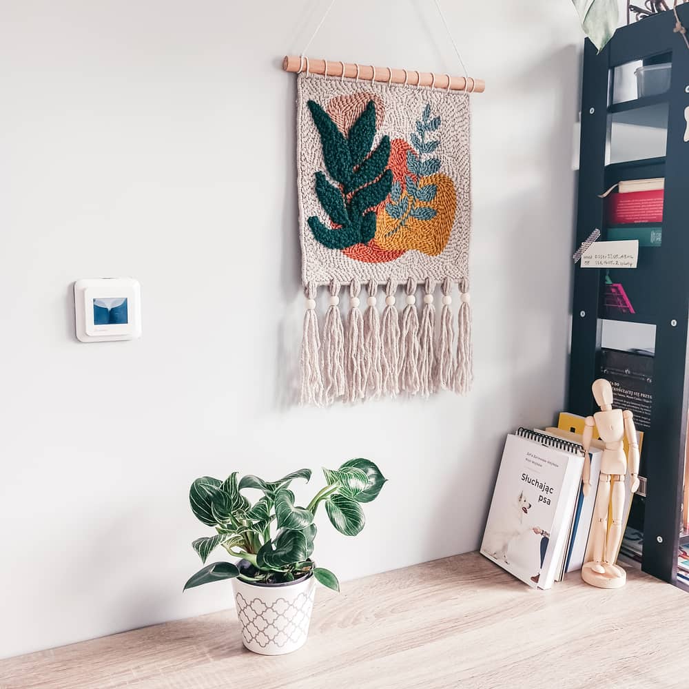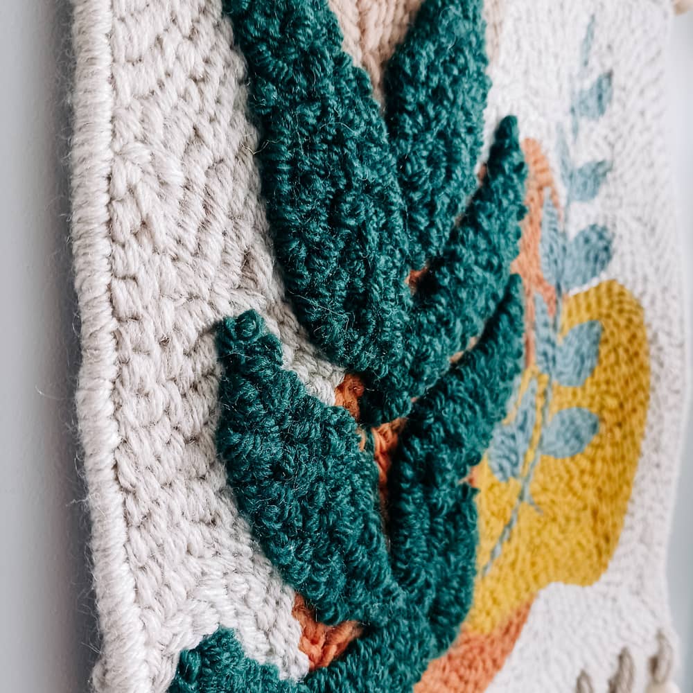 Makatka „Botanika” została wykonana ręcznie w technice punch needle, czyli haftu pętelkowego. Do tego projektu została użyta miękka włóczka akrylowa z domieszką wełny 30%.