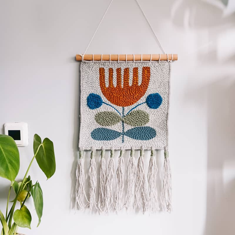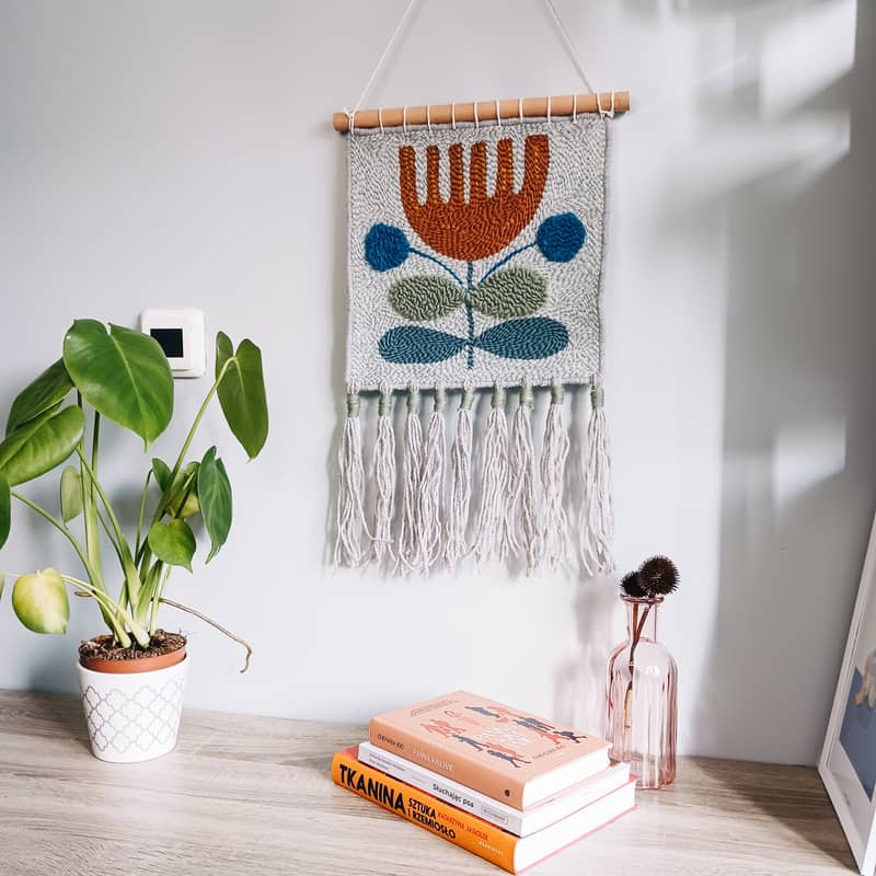 Makatka wykonana jest w technice haftu punch needle. Jest trójwymiarowa, pewne elementy są wypukłe. Umocowana na solidnym bukowym kiju i wykończona długimi frędzlami, które dodają jej uroku i boho stylu.