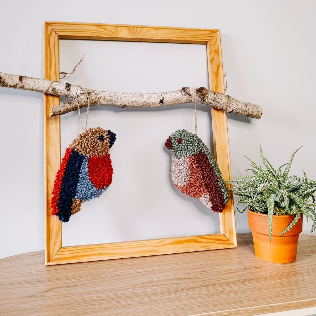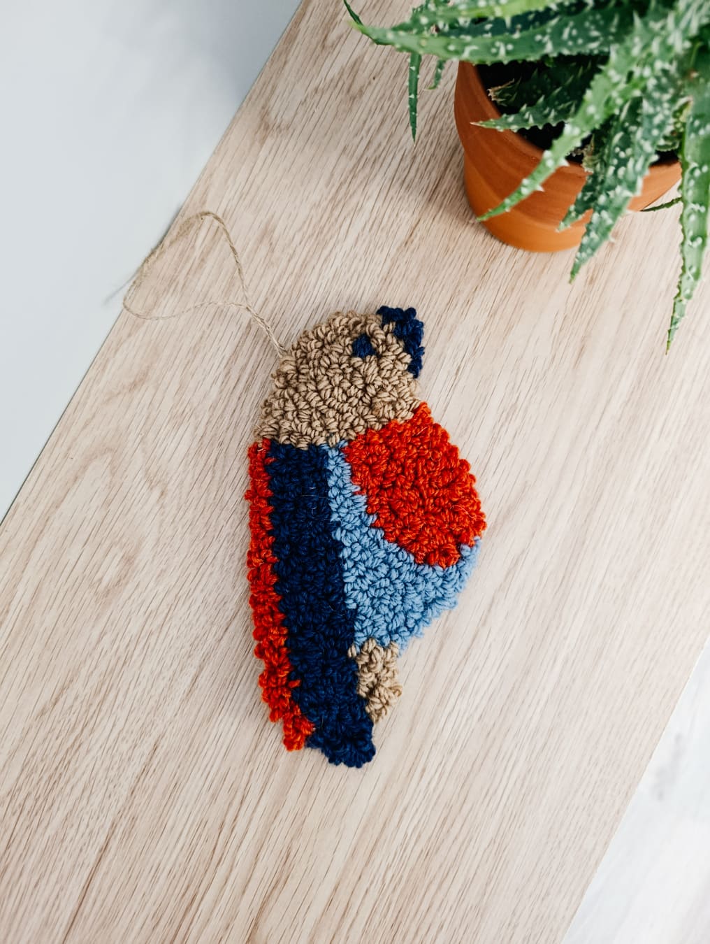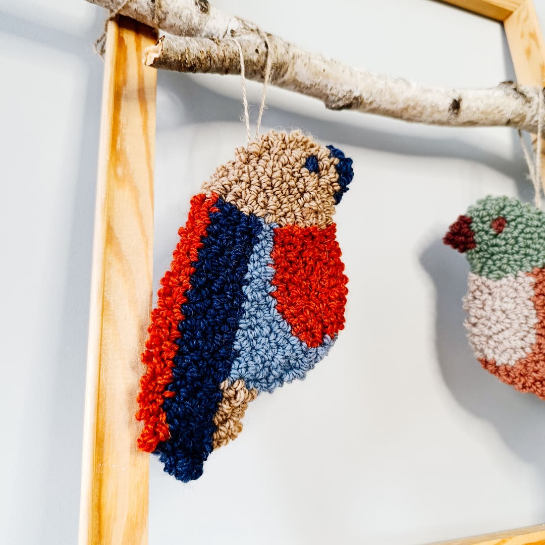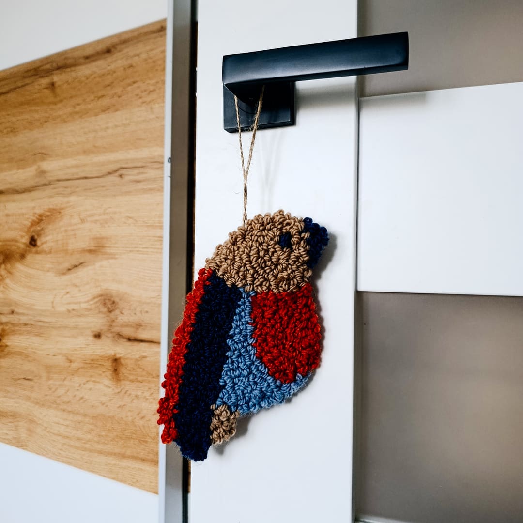 Miękka wełniana zawieszka ścienna w kształcie ptaszka. Zrobiona została w technice punch needle z miękkiej, wełnianej włóczki. Tył wykończony filcem, co zapewnia estetyczny wygląd i trwałość.