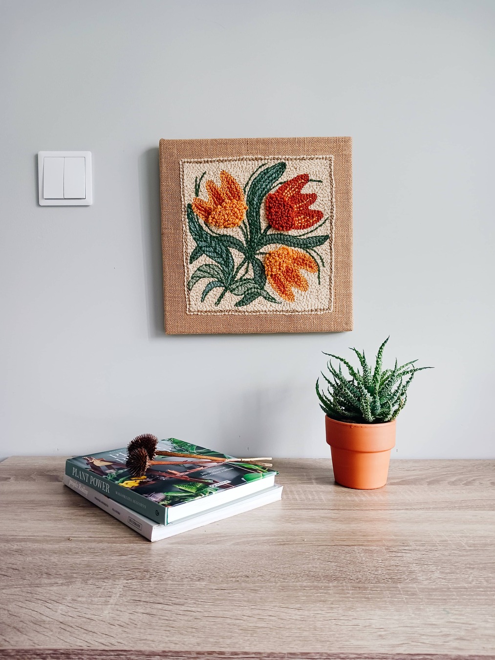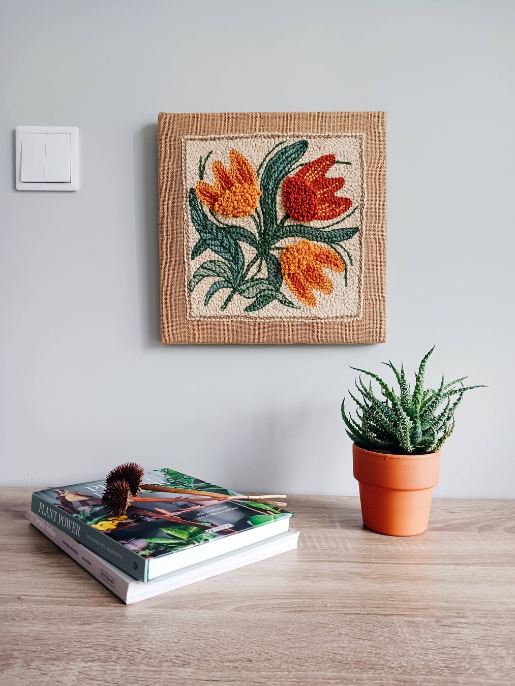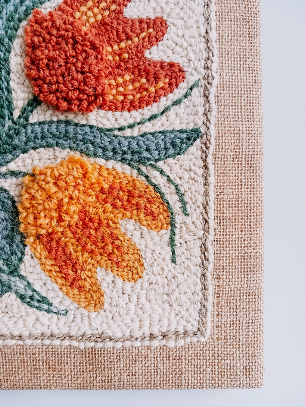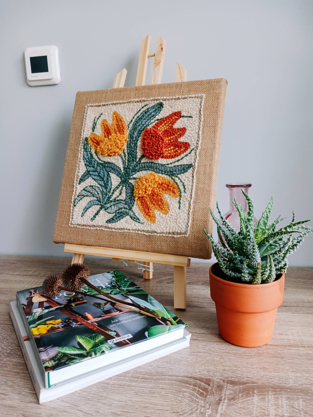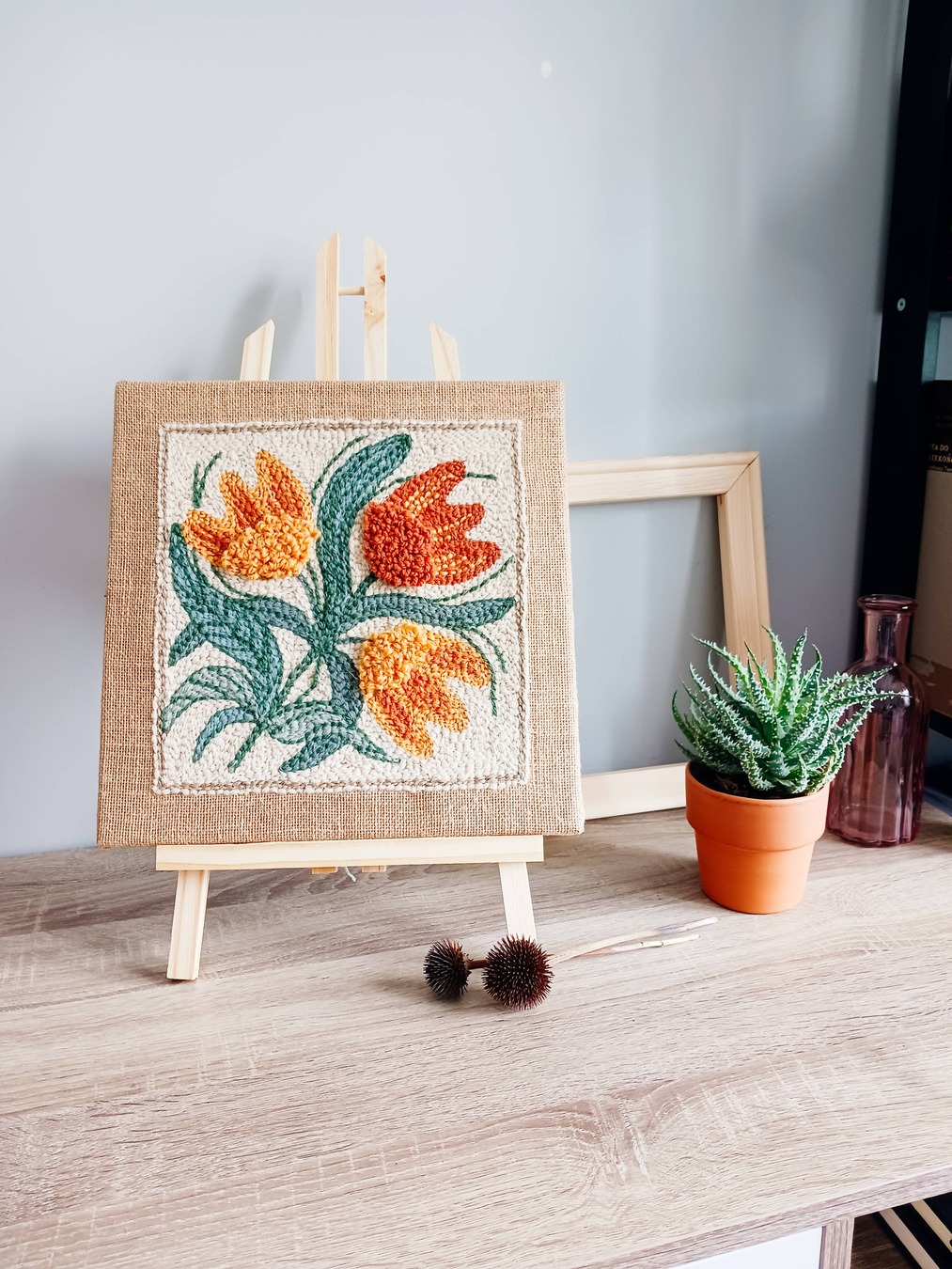 Obrazek został ręcznie wyhaftowany w technice punch needle szorstką przędzą wełnianą na naturalnej jucie naciągniętej na drewnianą ramę.