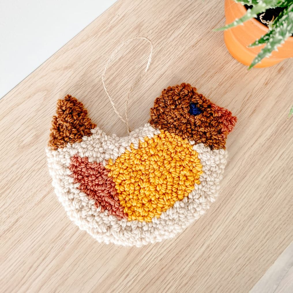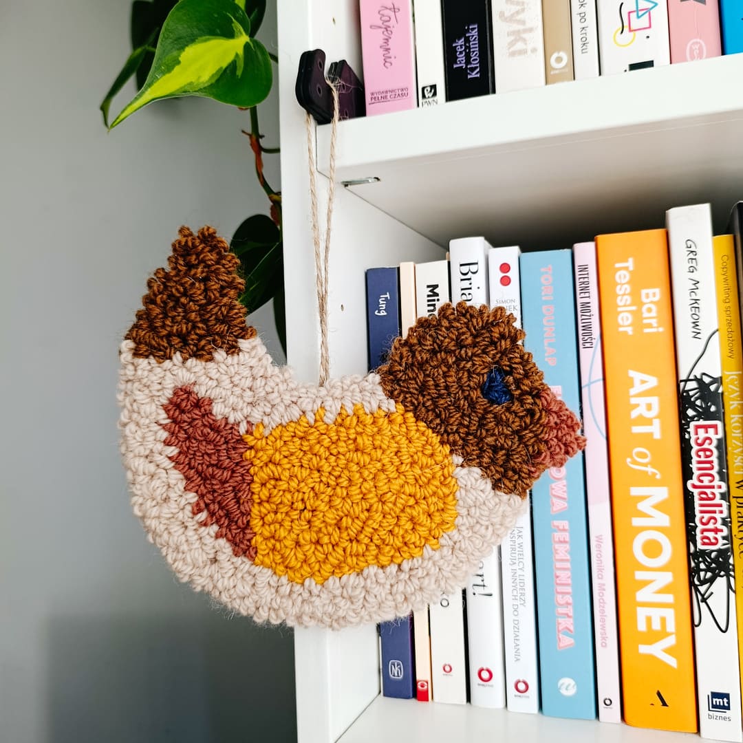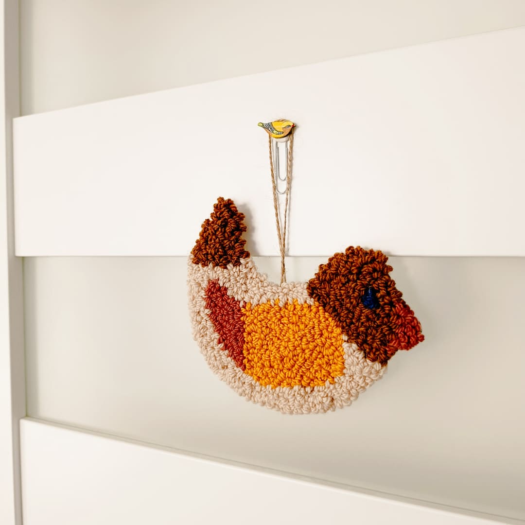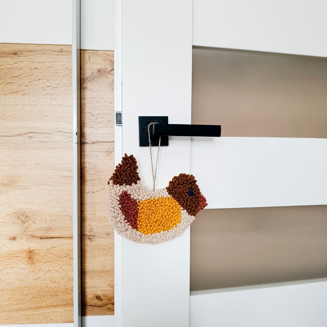 Miękka zawieszka ścienna w kształcie ptaszka. Zrobiona została w technice punch needle z miękkiej, wełnianej włóczki. Tył wykończony filcem, co zapewnia estetyczny wygląd i trwałość.